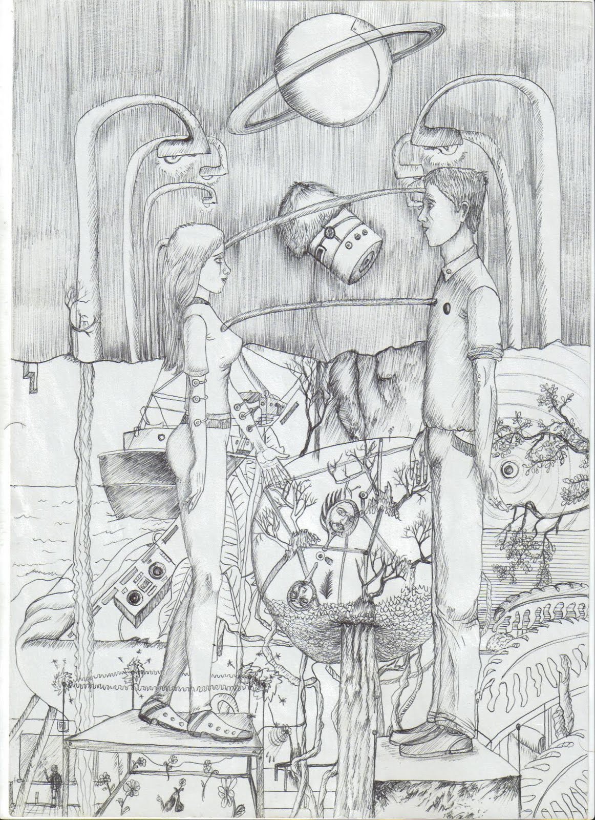 surrelista .Esto podría ser un sueño que tuve .Una imagen onírica sacada de mi subconsciente ,algo que me explicara a mi .En lugar de que el dibujo explique algo propio ,el dibujo me explica a mi .Y es lo que en fondo de mi mente